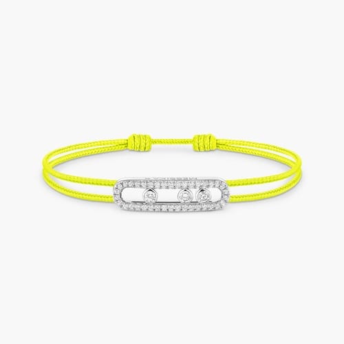 A neon yellow cord bracelet featuring a paved Move motif in white gold 750 set with diamonds and with 3 movings diamonds in its center