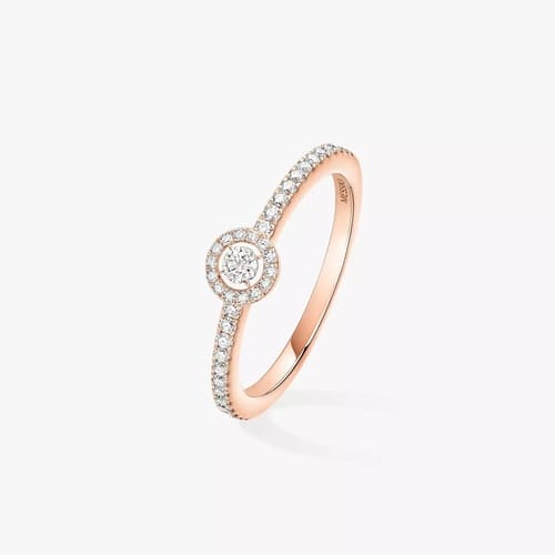 A solitaire ring in rose gold 750 featuring a central brilliant-cur diamond encircled by a radiant pavé halo and a diamond-set band
