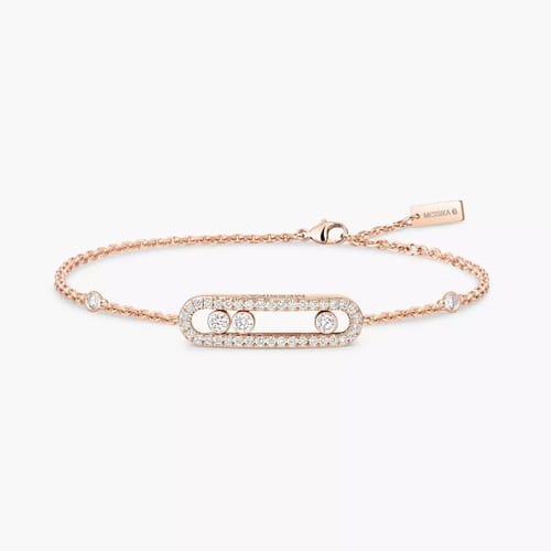 Baby Move pavé bracelet in rose gold 750 features 2 diamonds on the chain and 3 moving diamonds nestled in a rose gold cage fully paved with diamonds