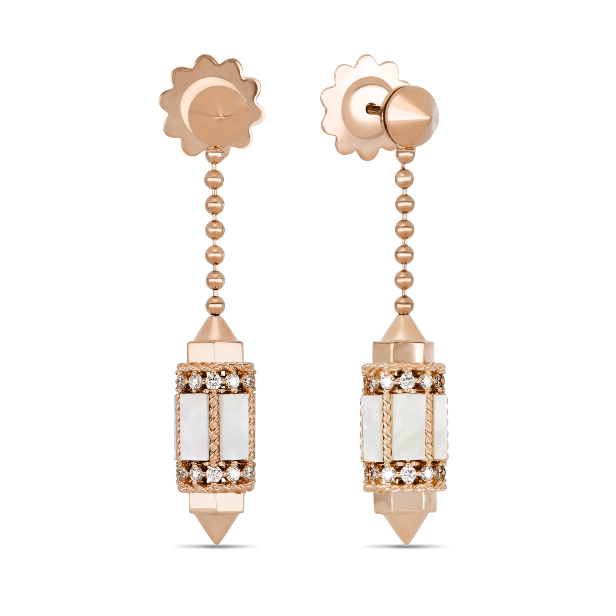 Dangle earrings in rose gold 750 featuring a vertical bead cascade and a cylindircal centerpiece set with white mother-of-pearl and diamonds, finished with a tapered cone details