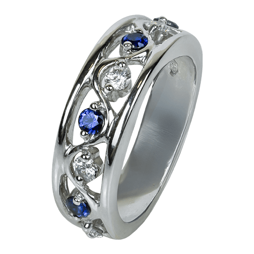 Filigree ring in white gold 750 set with 4 diamonds and 4 blue sapphires