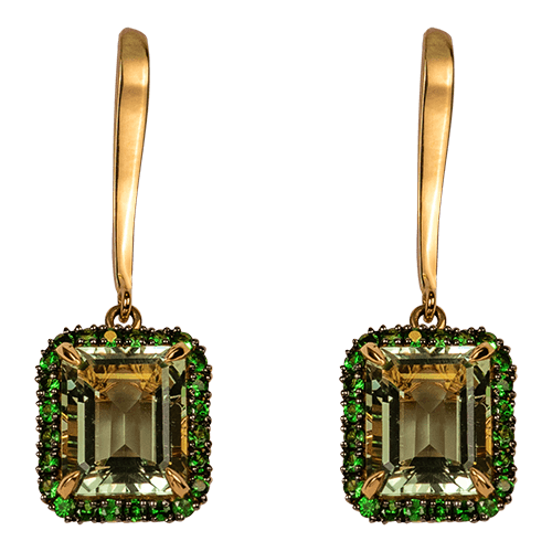 French hook earrings in yellow gold 750 set with 2 emerald-cut prasiolites and 48 brilliant-cut tsavorites