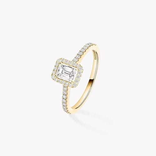 Joy solitaire ring in yellow gold 750 featuring an emerald-cut diamond framed by Messika’s signature openwork pavé halo and a diamond-set band