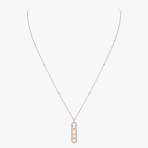 Necklace in rose gold 750 celebrating a decade of Messika’s iconic collection featuring a vertically aligned fully set Move motif with 3 moving diamonds at its center and 4 diamonds along the chain
