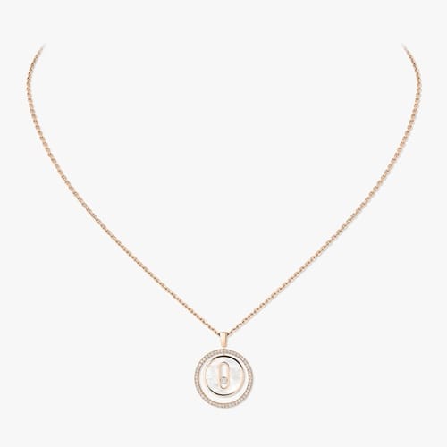Necklace in rose gold 750 featuring a Lucky Move motif with a rotating medallion inlaid with white mother-of-pearl and a central diamond held by a symbolic groove and a halo of pavé-set diamonds around the medallion