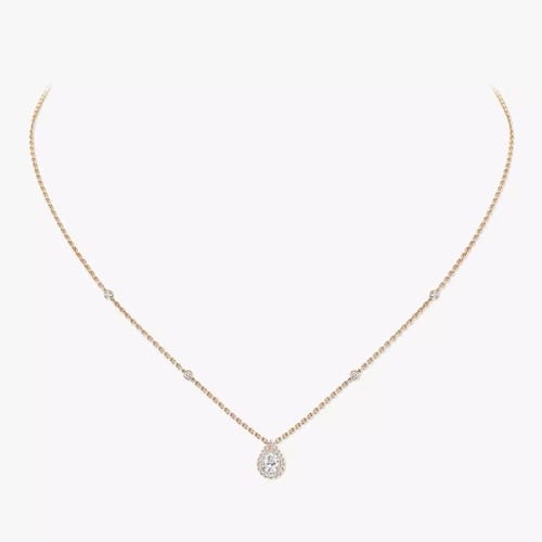 Necklace in rose gold 750 featuring a pear-shape diamond encircled by a halo of brilliant-cut diamonds