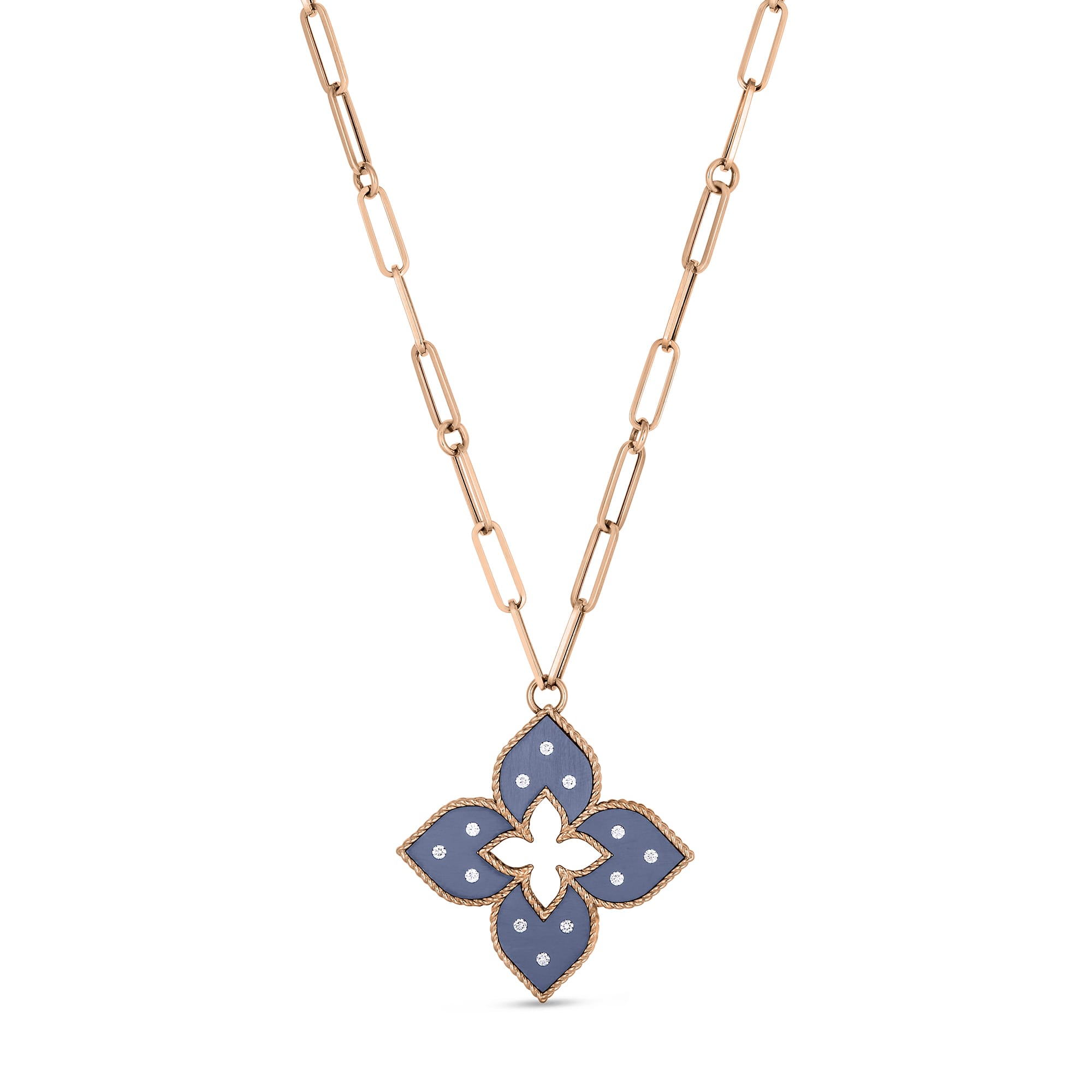 Necklace in rose gold 750 featuring Roberto Coin’s Flower motif with blue titanium inlays set with 12 diamonds
