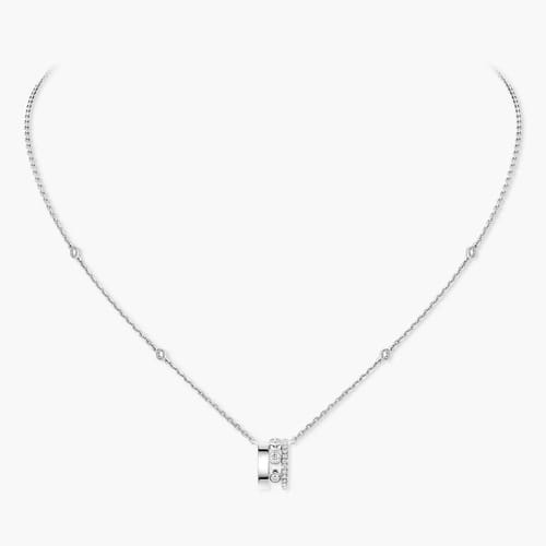 Necklace in white gold 750 featuring a Move Romane design with 2 assymmetrical line one polised and one pavé-set along with the signature moving diamonds in the center all on a diamond-accented chain