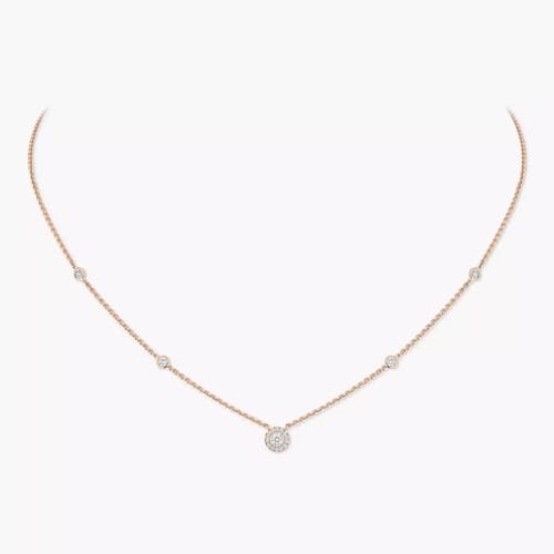 Necklace in white gold 750 featuring a round central diamond surrounded by a micro-set halo suspended from a diamond-accented chain