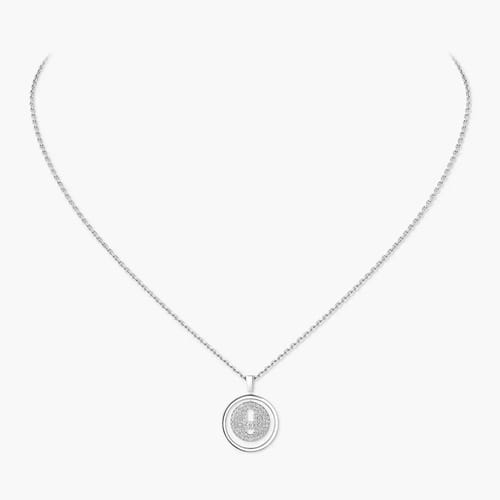 Necklace in white gold 750 featuring the signature moving diamond encircled by a halo of diamonds suspended from a fine chain with a hidden sliding mechanism for adjustable styling