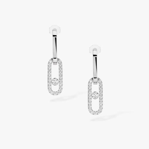 Pendant earrings in white gold 750 featuring a pavé-set move motif with a central moving brilliant-cut diamond. The design is secured with an Alpa clip system for optimal comfort and stability