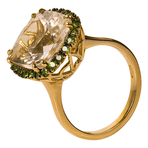 Ring in yellow gold 750 set with 1 cushion-cut prasiolite haloed by 24 tsavorites
