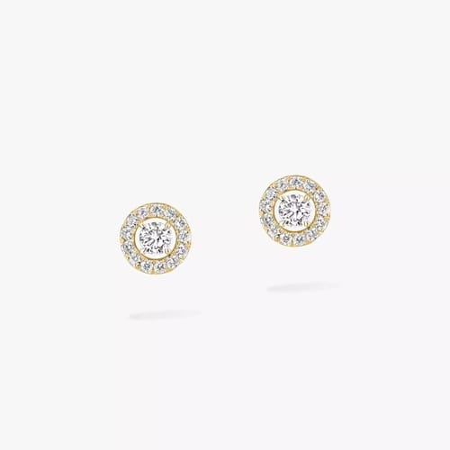 Studs earrings in yellow gold 750 featuring a 0.03 ct brilliant-cut diamond as center stone surrounded by delicate halo of micro-set diamonds